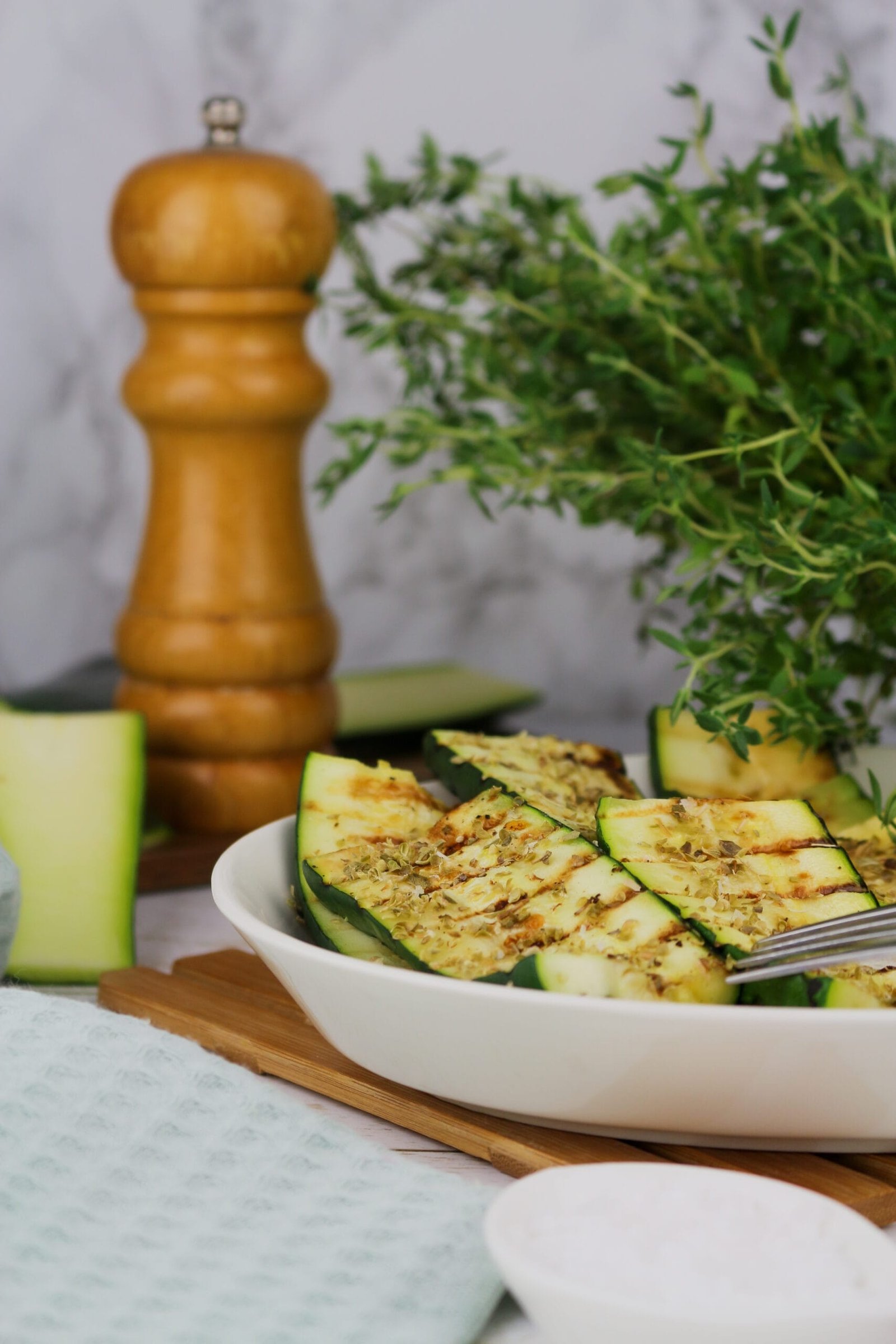 - Nuplaukite cukinijas ir supjaustykite jas 0,5–1 cm storio griežinėliais. Tada apšlakstykite alyvuogių aliejumi (nebūtina) ir pagardinkite prieskoninėmis žolelėmis bei druska.