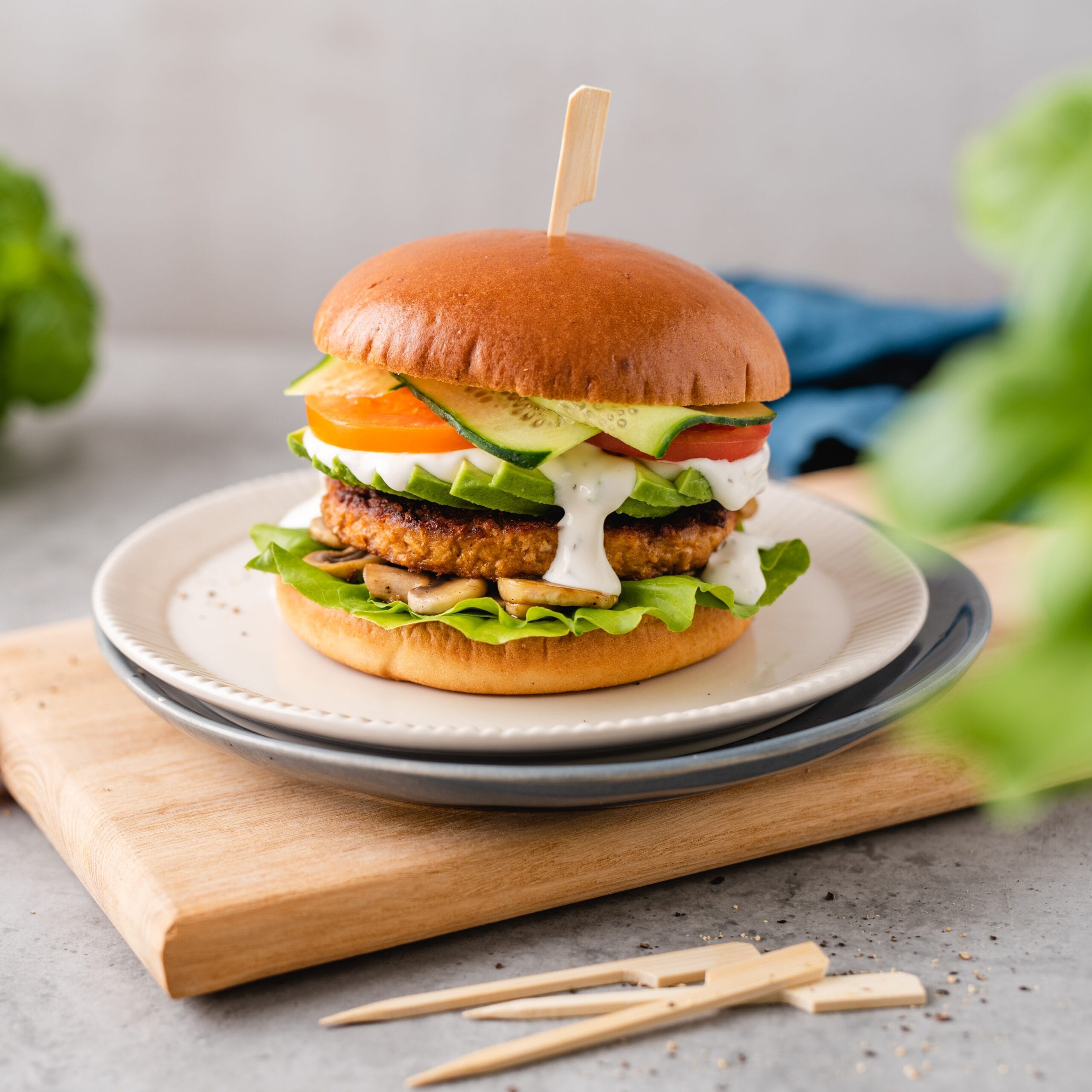 - Vidinę bandelių pusę aptepkite humusu, ant jo dėkite kelis šviežių salotų lapus, o virš jų paskleiskite keptus pievagrybius. Ant viršaus dėkite keptą „Anamma“ sojų maltinuką. Tada riekelėmis supjaustykite avokadą ir paskleiskite jas ant maltinuko. Apšlakstykite vienu arba dviem šaukštais padažo. Ant viršaus už dėkite porą pomidoro griežinėlių ir agurko riekelių ir užvožkite burgerį viršutine bandelės dalimi.