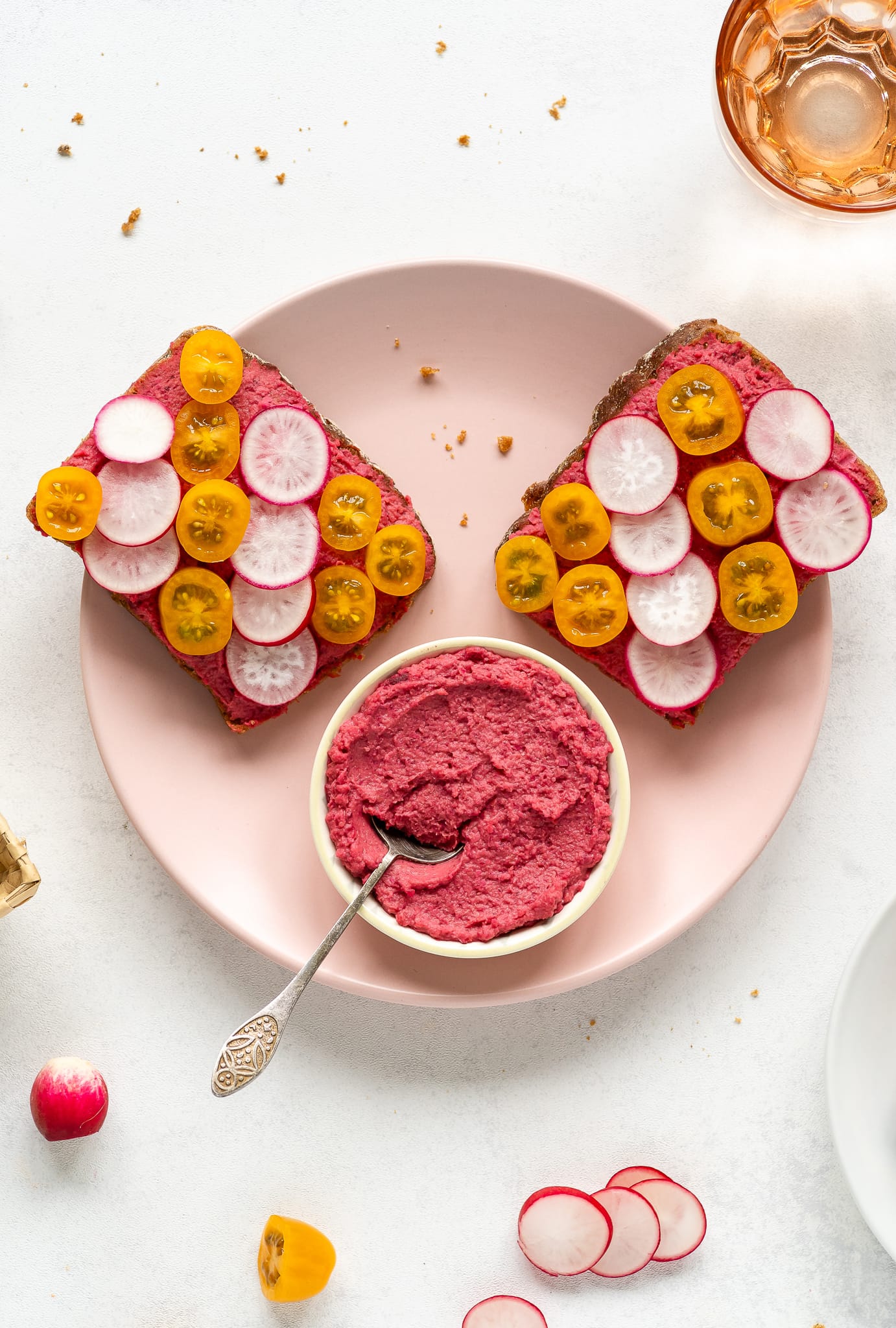 - Jei ruošite sumuštinius, ištepkite duoną humusu ir ant viršaus išdėliokite pjaustytus ridikėlius, pomidorus ir kitus priedus.