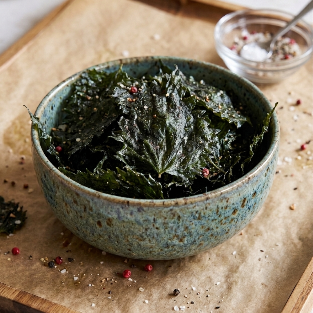 - Dėkite po vieną lapelį ant kepimo popieriumi išklotos skardos ir kepkite orkaitėje 130 °C temperatūroje apie 10 minučių, kol dilgėlės taps traškios. Jei turite džiovyklę, galite džiovinti ir joje.