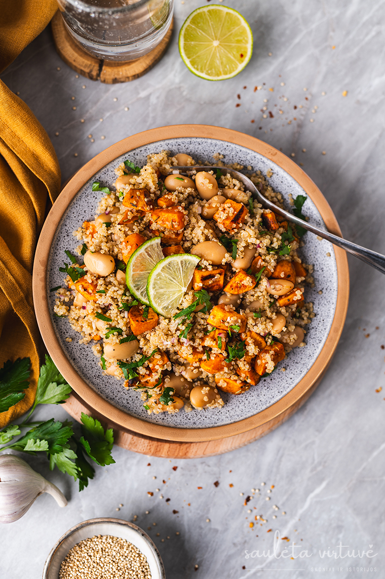 - Patiekite. Į dubenį su pupelėmis suberkite keptas saldžiąsias bulves ir virtas bolivinės balandos kruopas. Išmaišykite. Jei norite, papuoškite smulkintomis petražolėmis ar žaliosios citrinos riekelėmis.