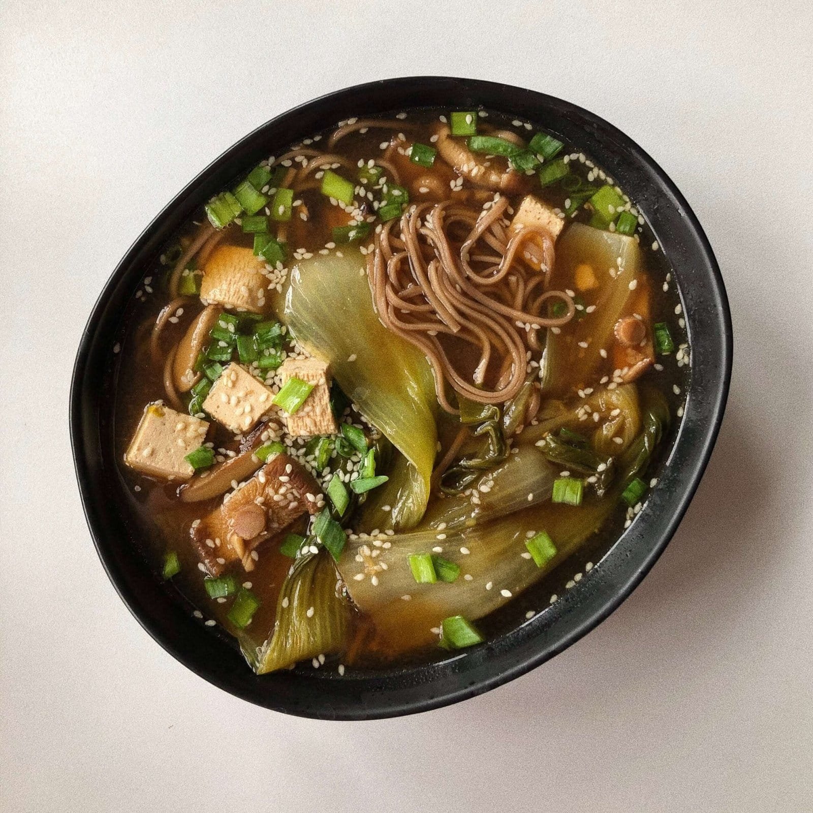 - Sumažinkite ugnį iki vidutinės. Supilkite sultinį arba mirkytų grybų skystį, soją bei actą, sudėkite tofu. Įmaišykite miso pastą ir leiskite mišiniui pavirti (maždaug 10–15 minučių), kol bok choy suminkštės.