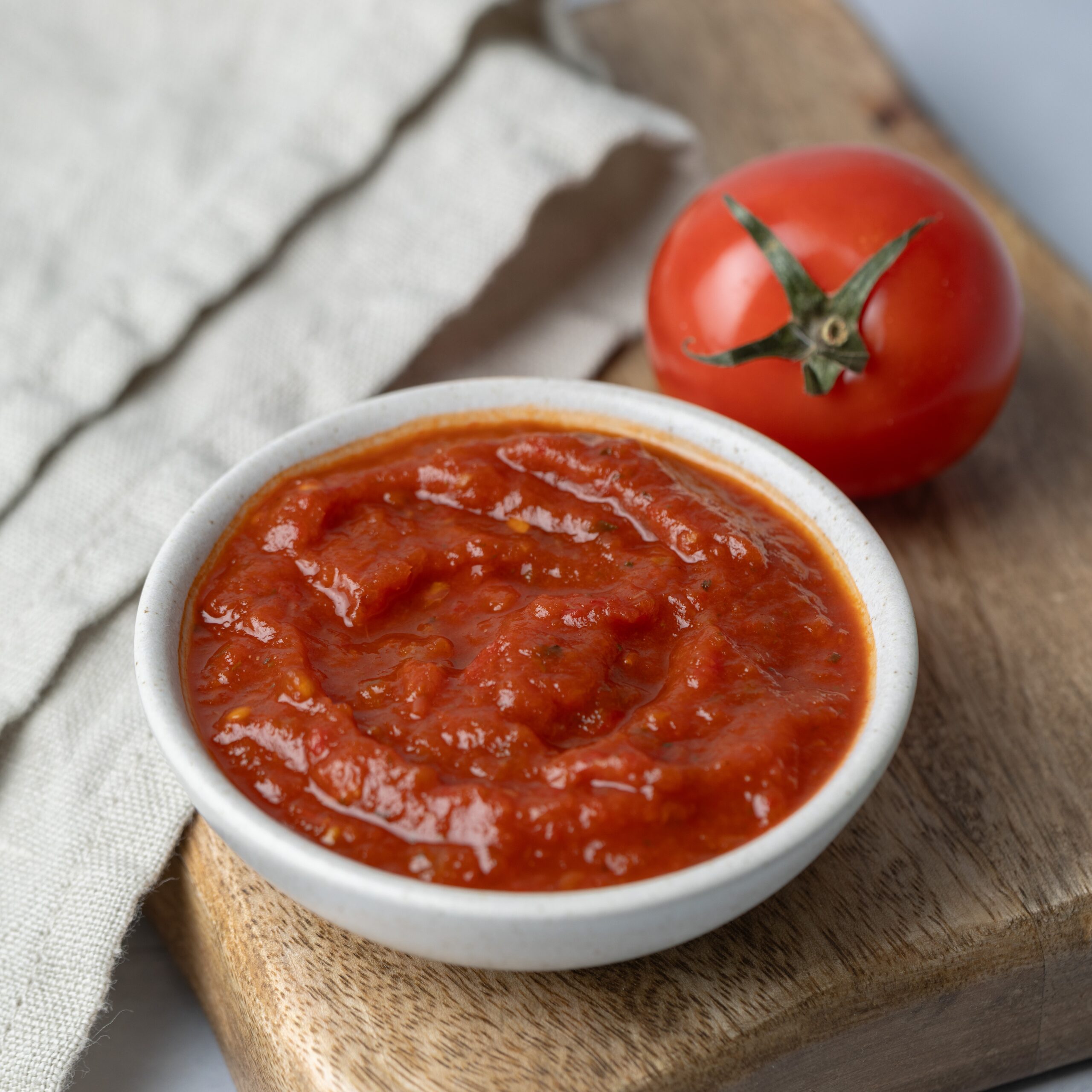 - 1 nedidelės skardinės konservuotų nuluptų pomidorų savose sultyse arba trintų konservuotų pomidorų (geriau, kad sudėtyje nebūtų citrinos rūgšties)