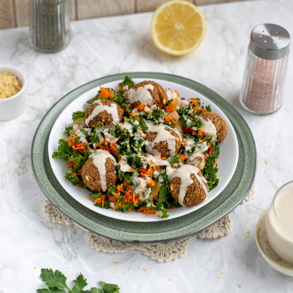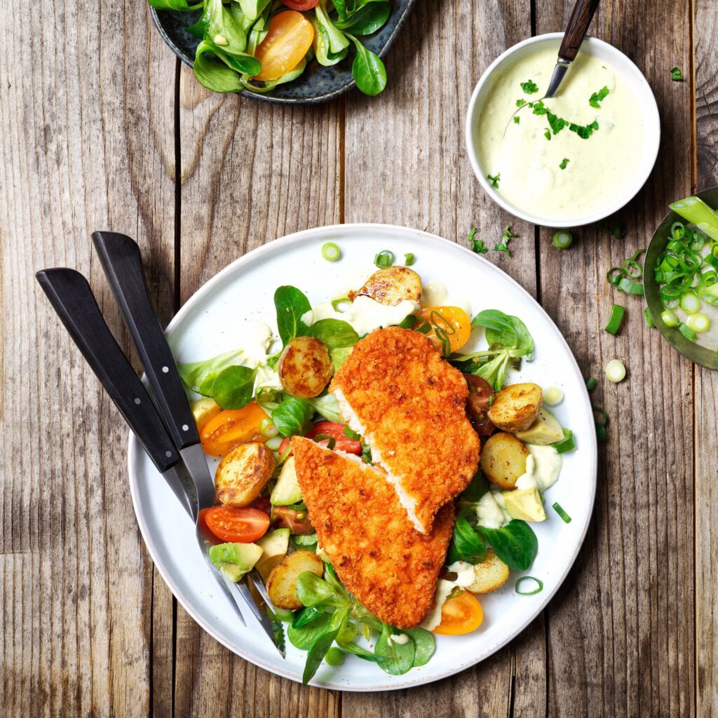 Augalinis šnicelis su bulvytėmis ir avokadų padažu
