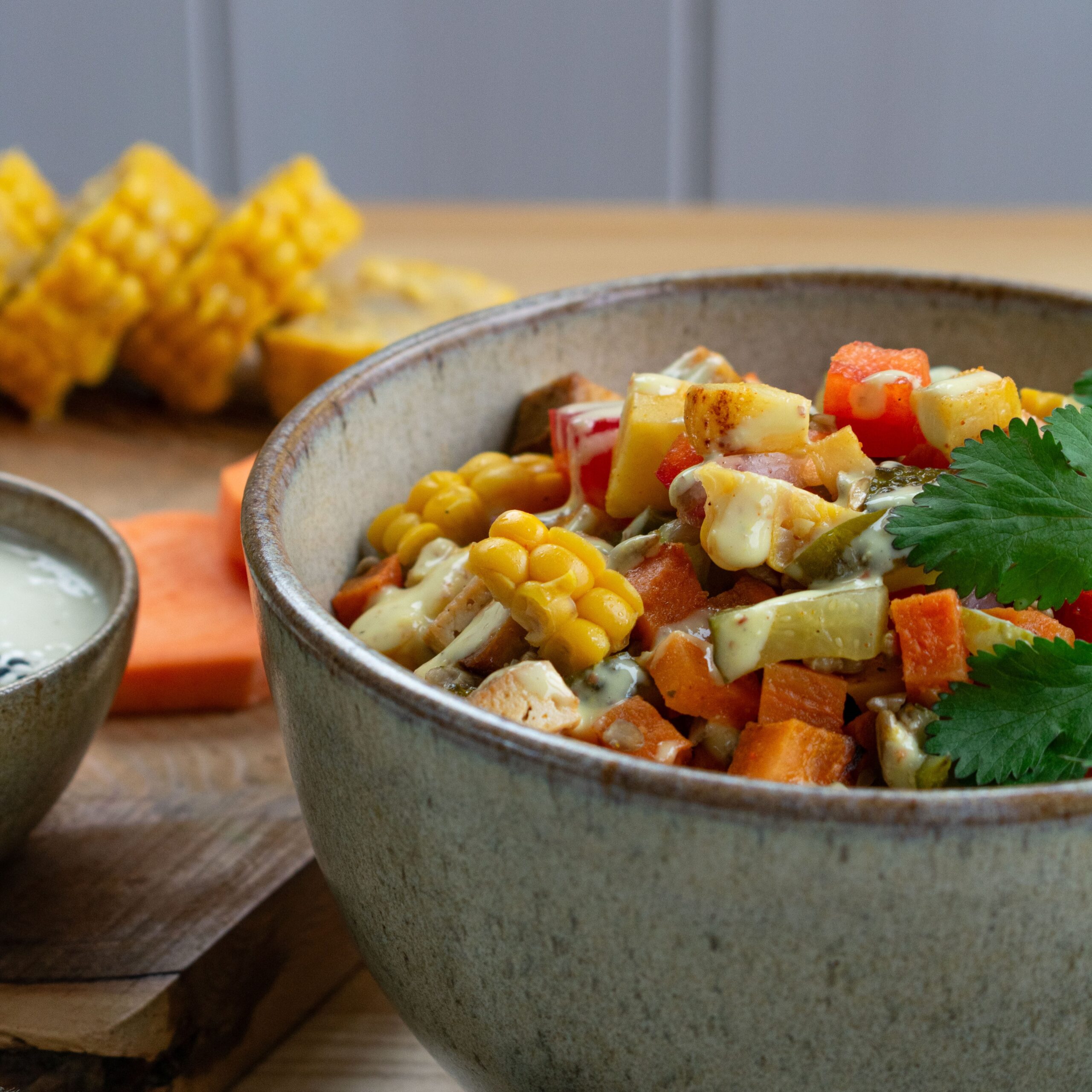 - Jei naudojate vakumuotą, išimkite iš pakuotės 1 kukurūzo burbuolę, nupjaukite jos šonus ir pasmulkinkite. Plonais mėnuliukais arba kubeliais supjaustykite agurką. Labai plonomis juostelėmis supjaustykite svogūną. 1 cm didumo kubeliais susmulkinkite papriką.