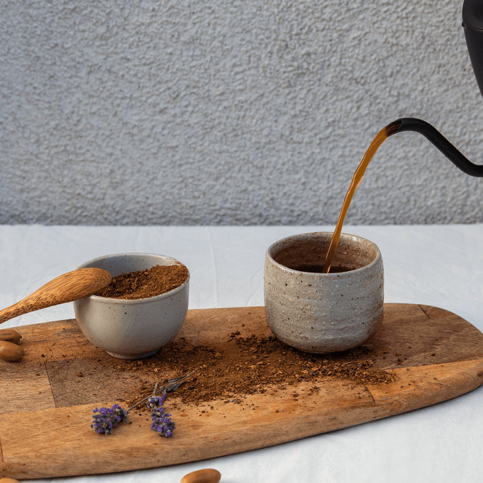 - Paruoškite gilių kavą. Jei kavą ruošite espresso aparatu – nepresuokite, paruoškite lyg juodą kavą. Jei espresso aparato nenaudosite, užpylę kavą vandeniu palaukite 5-7 minutes ir nukoškite per sietelį.